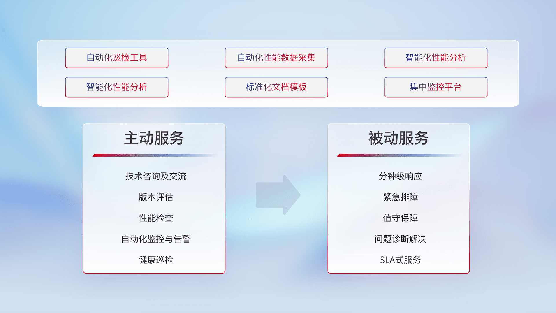 智能化工具和标准化文档,,,,保障服务质量,,,,提供主动服务(包含技术咨询、、版本评估、、、、性能检查、、自动化监控与告警、、、健康巡检)和被动服务包含(分钟级响应、、、紧急排障、、、值守保障、、、、问题诊断解决、、SLA服务)。。